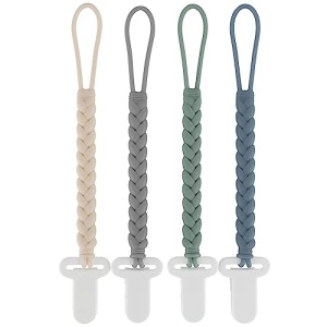 4-Pack Silicone Pacifier Clips with a Woven Rope Shape for Baby Boys and Girls – Flexible and Rust-Free Holders for Teething Relief and Baby Essentials, Safe for Newborns (Grey)